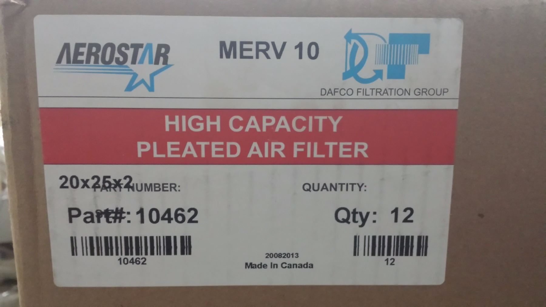 New box of 12 pcs Dafco Filtration Group. Aerostar MERV 10 HIGH CAPACITY PLEATED AIR FILTER. PARTS # 10462. Size 20x25x2’’. New filters