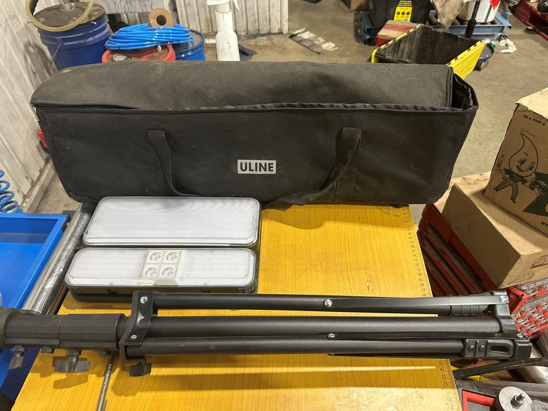 Lampe LED pour chantiers et réparations, avec 3 niveaux de luminosité, lampe détachable magnétique, trépied télescopique 360°, batterie rechargeable offrant 11 heures d’autonomie.